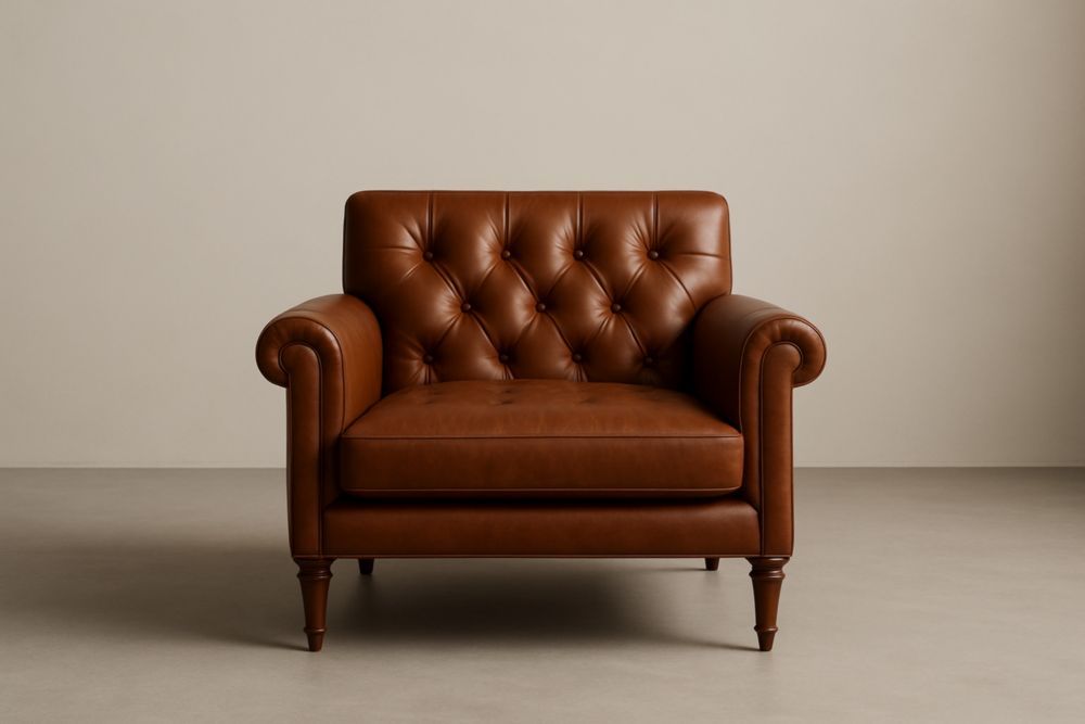 Poltrona in Pelle Marrone con Bottoni in Legno